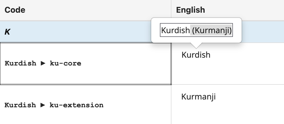 | ckb | Sorani Kurdish |